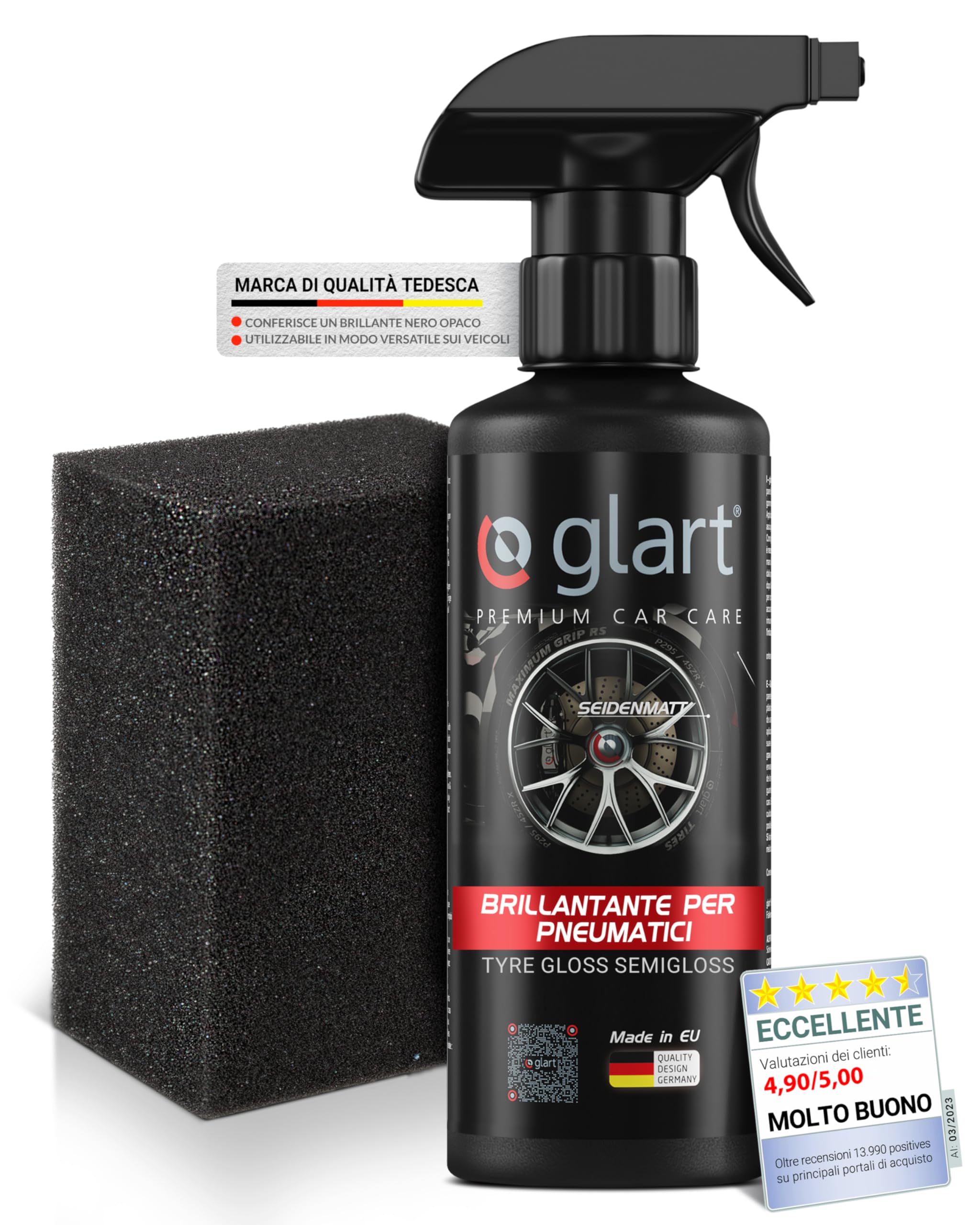 Glart 45RK lucidante per pneumatici, cura dei pneumatici, cura della gomma, lucentezza opaca e setosa, 500 ml, con spugna applicativa