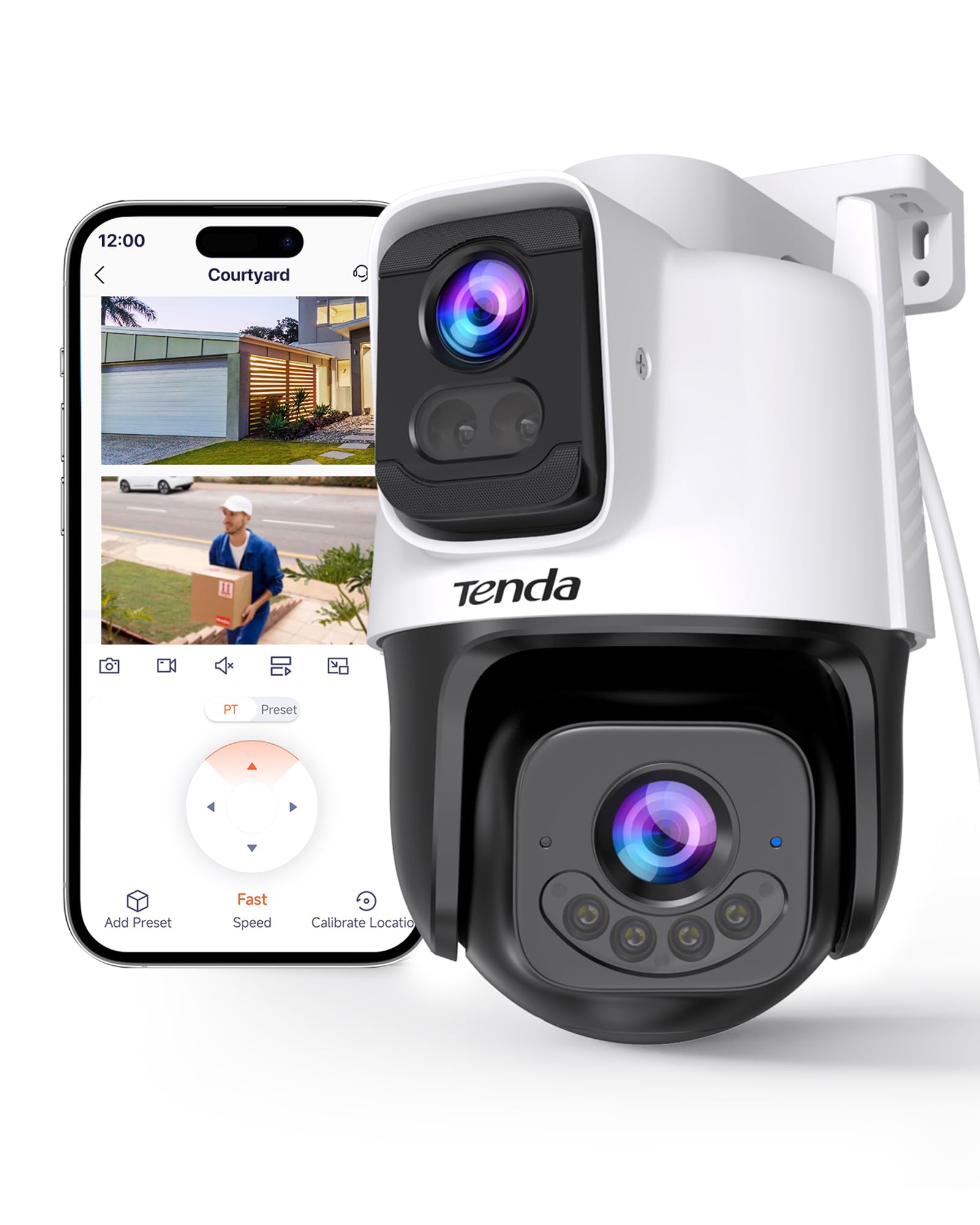 Tenda CH9 Telecamera Wi-Fi Esterno Doppia Lente 2K+2K, Wi-Fi 6 PTZ 360°, Pattugliamento Automatico, Visione Notturna a Colori, Allarme Sonoro/Luminoso, Rilevamento Umano/Veicoli, IP65