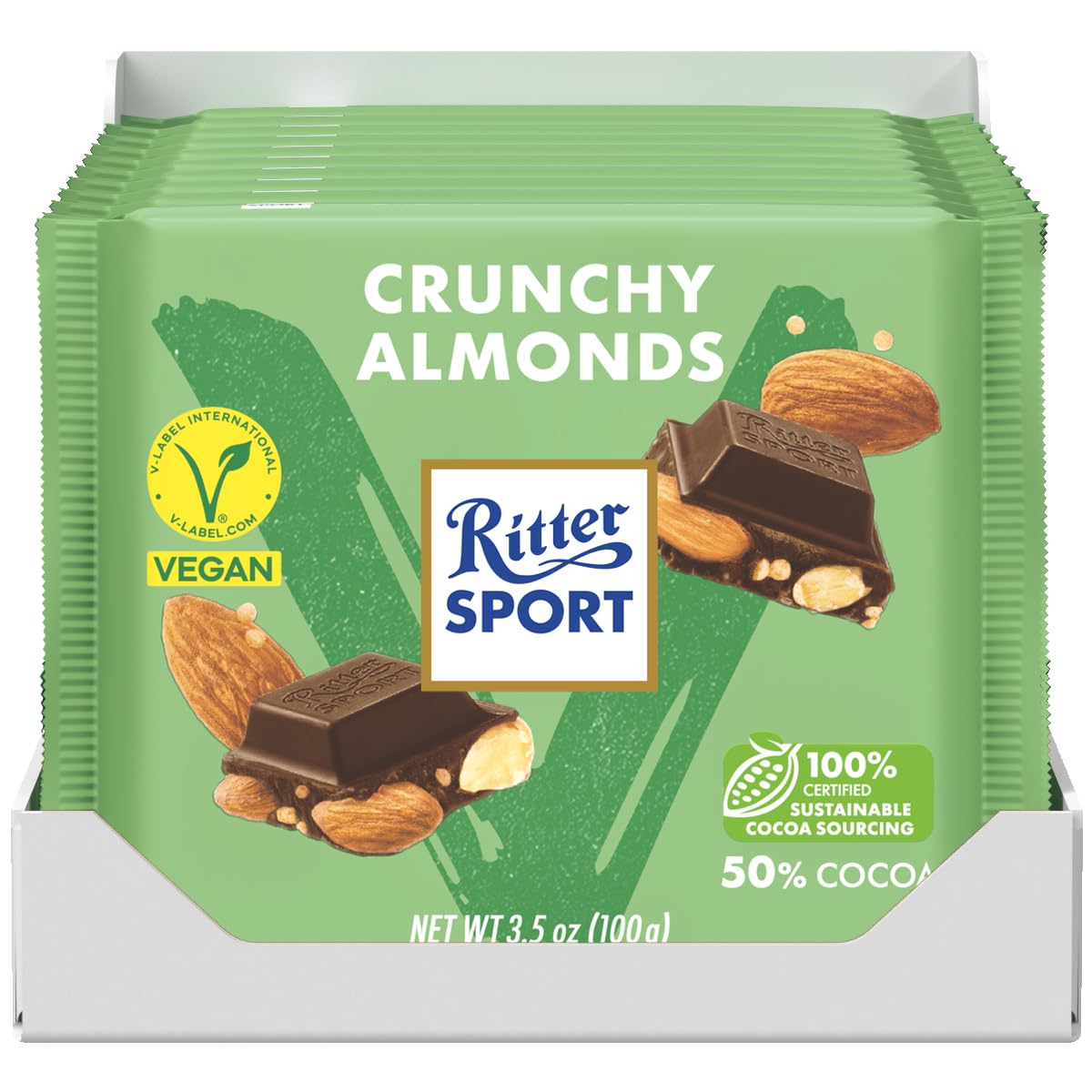 Ritter Sport Mandorle Croccanti Vegan, 10 Tavoletta di Cioccolato Fondente con Mandorle Intere, Pasta di Nocciole e Quinoa Croccante, Cacao 100% Certificato Sostenibile, 10 Pezzi da 100 g