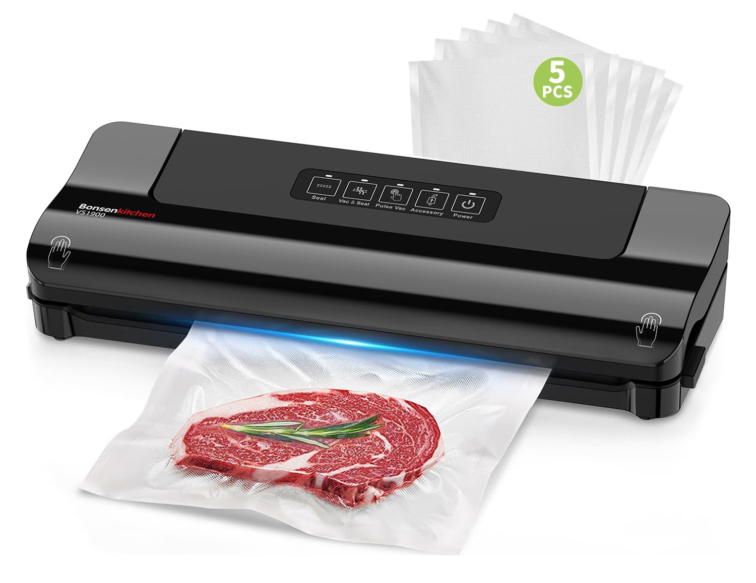 Bonsenkitchen Macchina per Sottovuoto Alimenti – Compatta, Funzionamento Continuo ad Alta Velocità, 4 Modalità, Include Sacchetti e Tubo Accessorio