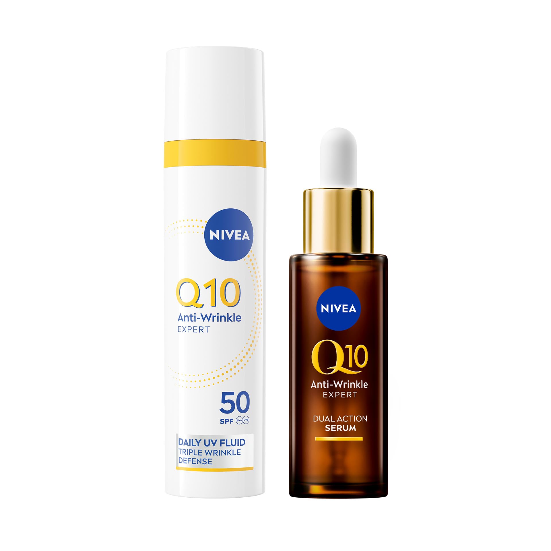 NIVEA Q10 Expert Skincare Kit Anti-Rughe, Set skincare completo con Siero Viso Doppia Azione 30 ml e Fluido UV Quotidiano Crema Viso SPF 50 40 ml per una pelle protetta e dall'aspetto più giovane