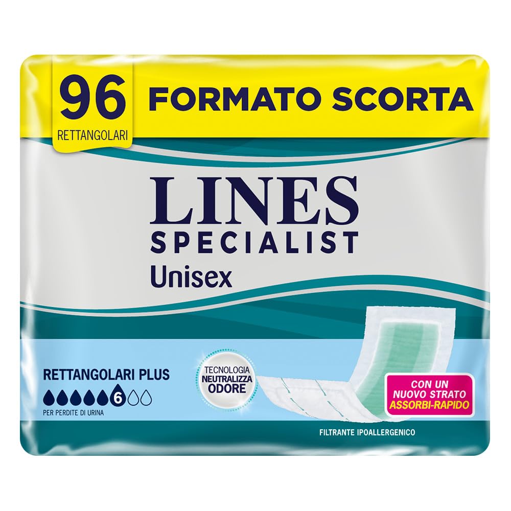 Lines Specialist Pannoloni Rettangolari, Pannoloni per Incontinenza Donna e Uomo, Asciutto Lampo, Tecnologia Neutralizza Odore, Assorbenza Plus, Taglia Unica, Scorta da 96 Unità