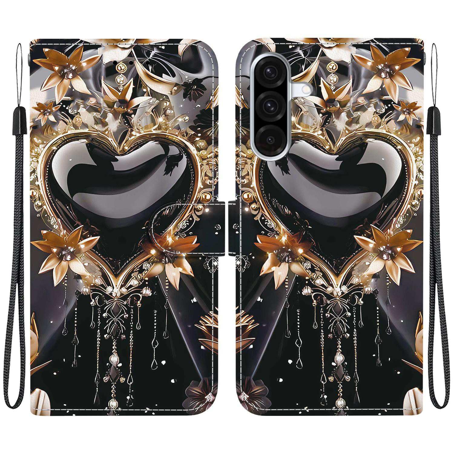 TVVTPU Cover per Samsung Galaxy A16 5G/4G, Custodia Premium Pelle PU Flip Libro Portafoglio Slot Schede Supporto Case Stampa Pelle Sintetica TPU Antiurto Case, Cuore Oro Nero