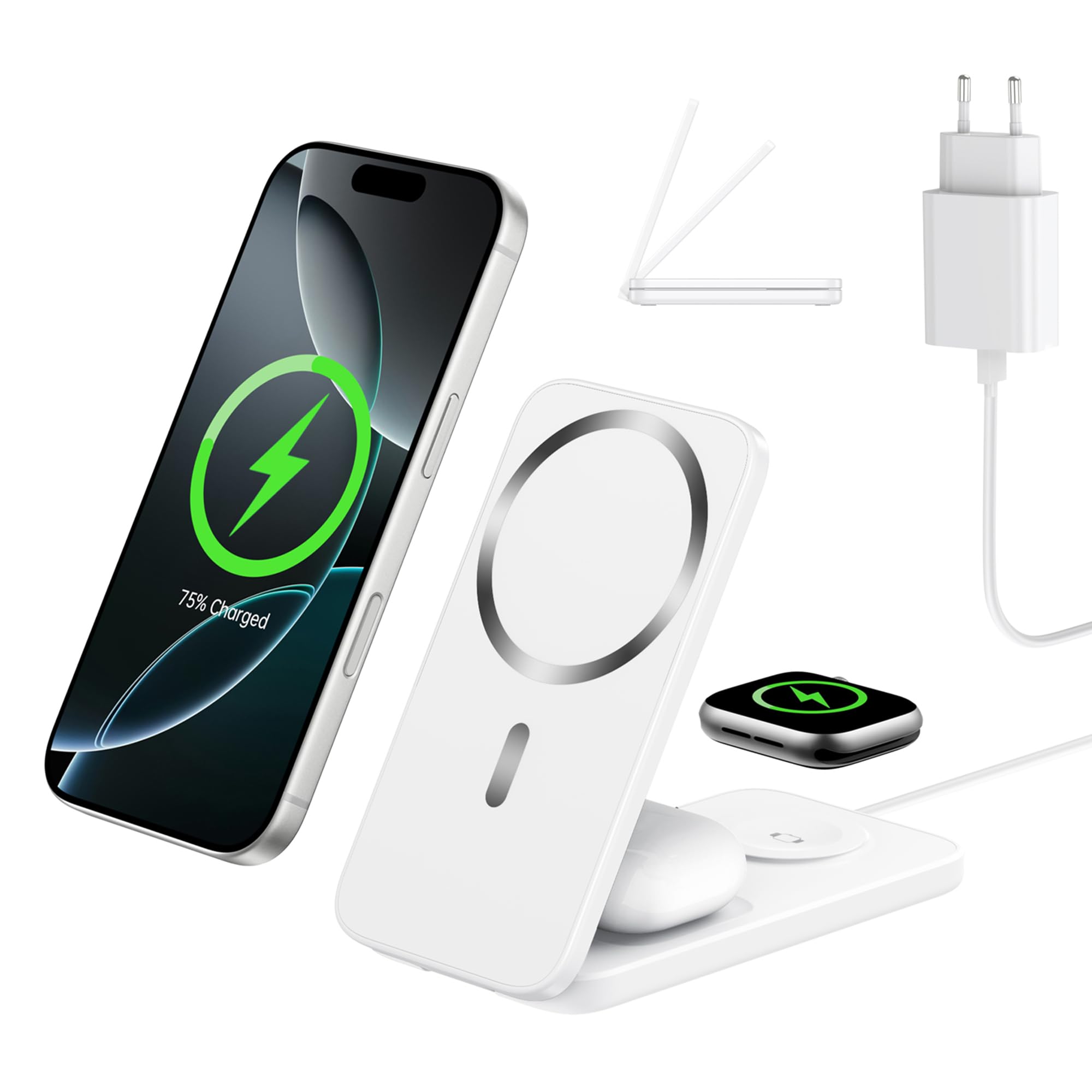 Caricatore Wireless 3 in 1 Compatibile MagSafe, Stazione di Ricarica Magnetica Pieghevole 15W per iPhone 17/16/15/14, Apple Watch e AirPods Dock di Ricarica Wireless per Scrivania Comodino e Viaggio